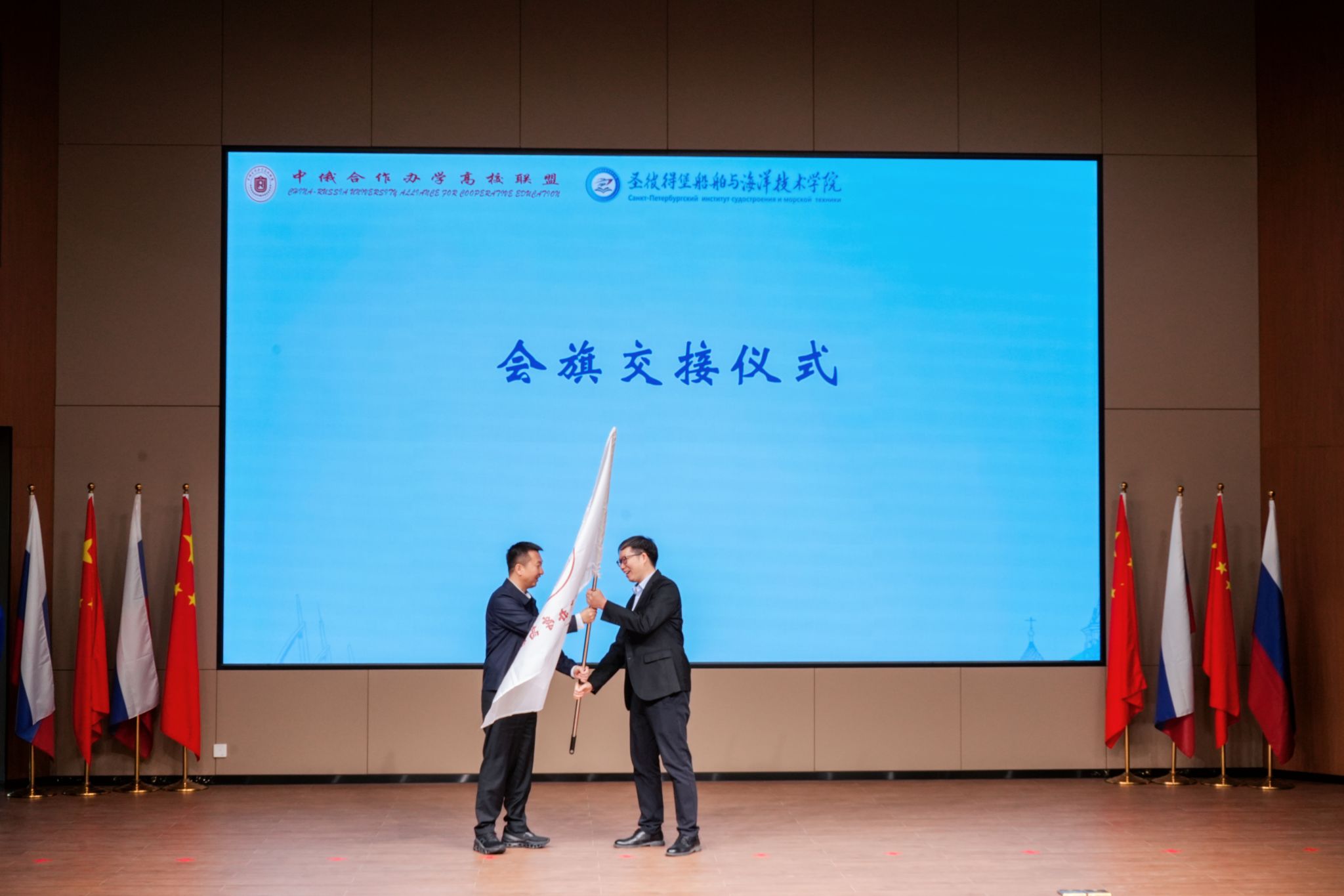 会议期间召开了中俄合作办学高校联盟常务理事会,决定由我校担任2025—2026年度轮值主席单位。在会旗交接仪式上,渭南师范银河澳门